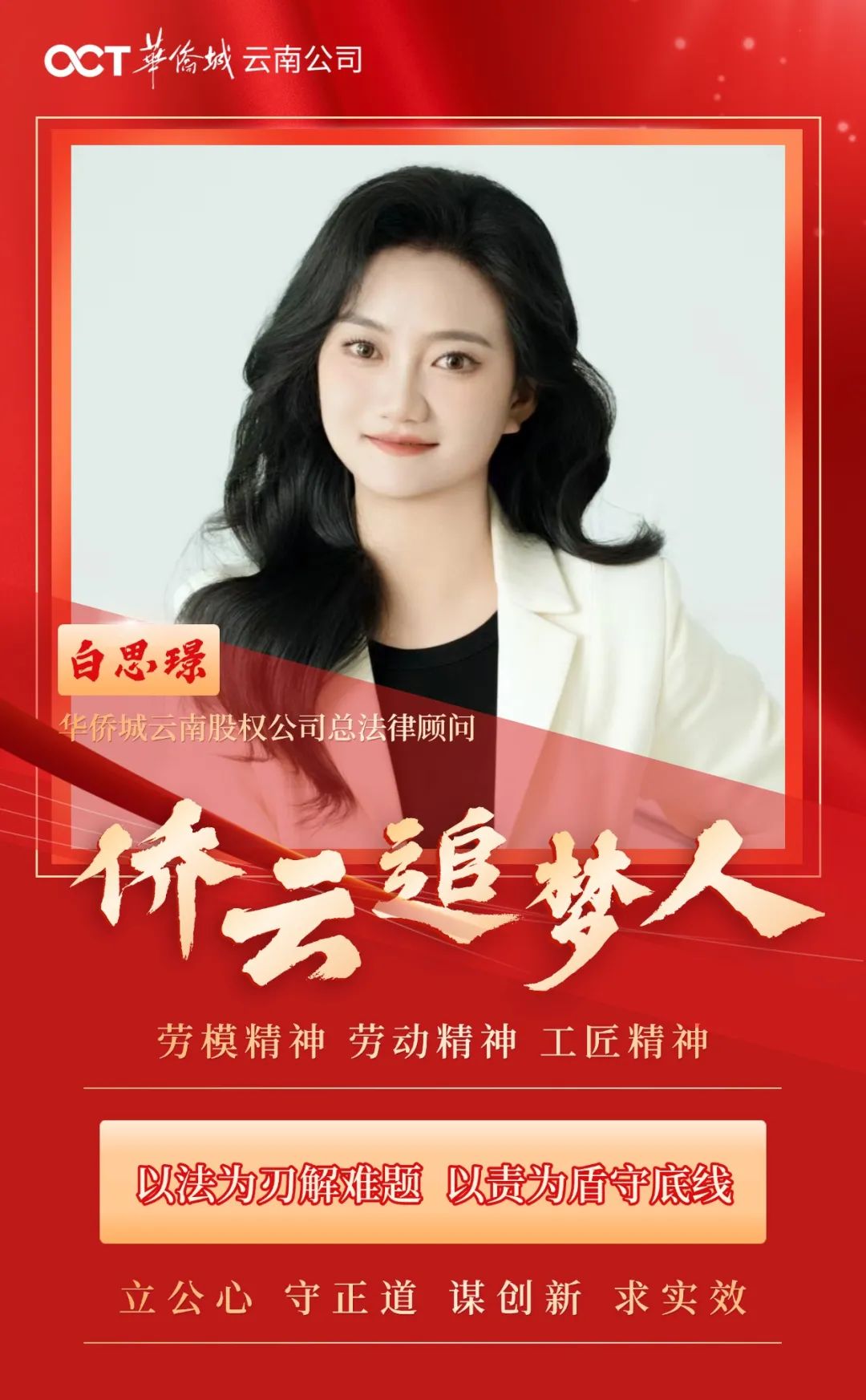 在云嶺大地上,一群懷揣熱忱與專業(yè)技能的僑云人,以勞模精神、勞動(dòng)精神、工匠精神為筆,以砥礪奮進(jìn)、精益求精為墨,在文化演藝、旅游、房地產(chǎn)等領(lǐng)域發(fā)光發(fā)熱,書寫“旅居云南”的故事。為傳遞僑云人堅(jiān)守“立公心、守正道、謀創(chuàng)新、求實(shí)效”的價(jià)值理念和行為準(zhǔn)則,激勵(lì)更多人為夢(mèng)想奮勇前行,華僑城云南公司特推出“僑云追夢(mèng)人”系列報(bào)道。本期讓我們一起來看看“法務(wù)達(dá)人”白思璟法務(wù)護(hù)航企業(yè)發(fā)展的故事。